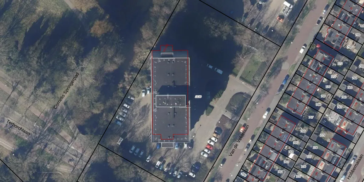 Het perceel waarop Van de Veldelaan 382 staat heeft een oppervlakte van 5865 m². Dit is een zeer groot perceel. De perceeloppervlakte wordt geregistreerd door het Kadaster. Gedetailleerde informatie over de maten van dit perceel kunt u vinden in het rapport Kadastrale kaart met maatvoering van Van de Veldelaan 382.