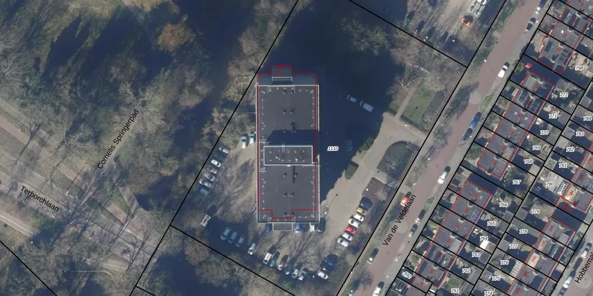 Het perceel waarop Van de Veldelaan 408 staat heeft een oppervlakte van 5865 m². Dit is een zeer groot perceel. De perceeloppervlakte wordt geregistreerd door het Kadaster. Gedetailleerde informatie over de maten van dit perceel kunt u vinden in het rapport Kadastrale kaart met maatvoering van Van de Veldelaan 408.