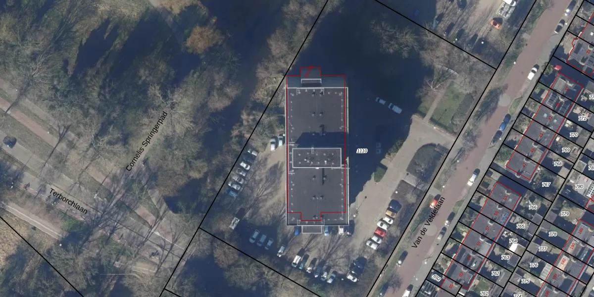 Het perceel waarop Van de Veldelaan 528 staat heeft een oppervlakte van 5865 m². Dit is een zeer groot perceel. De perceeloppervlakte wordt geregistreerd door het Kadaster. Gedetailleerde informatie over de maten van dit perceel kunt u vinden in het rapport Kadastrale kaart met maatvoering van Van de Veldelaan 528.