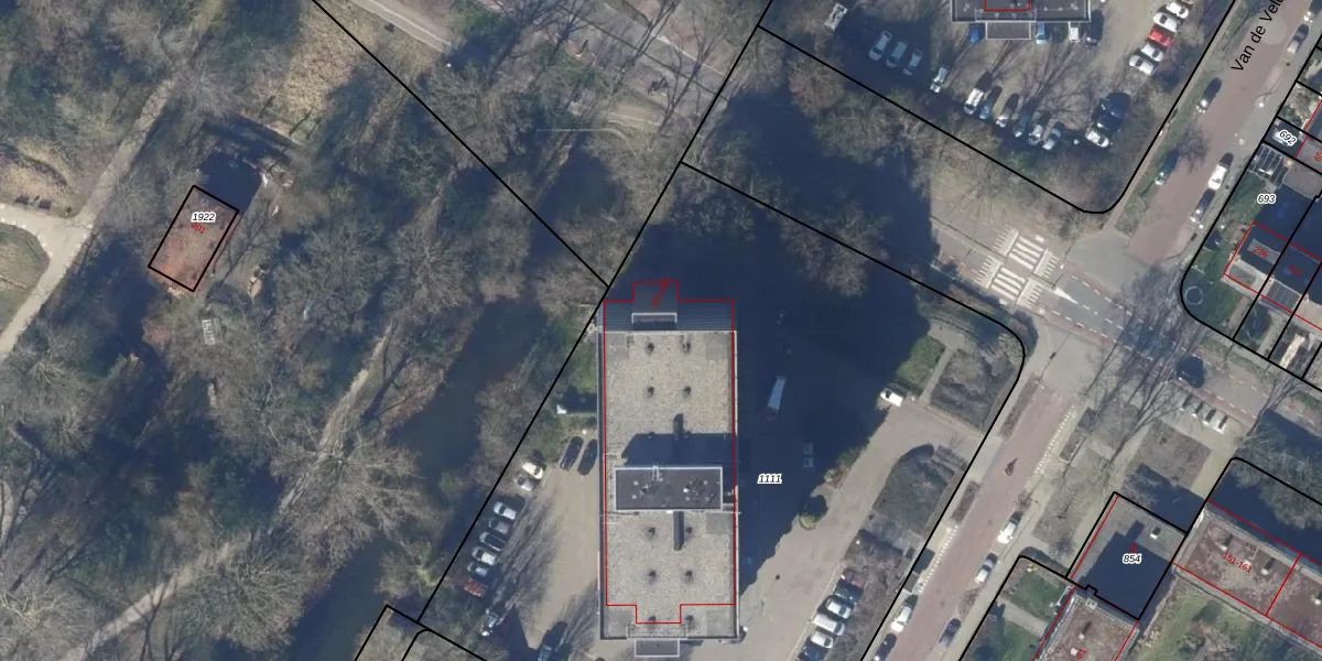 Het perceel waarop Van de Veldelaan 822 staat heeft een oppervlakte van 4954 m². Dit is een zeer groot perceel. De perceeloppervlakte wordt geregistreerd door het Kadaster. Gedetailleerde informatie over de maten van dit perceel kunt u vinden in het rapport Kadastrale kaart met maatvoering van Van de Veldelaan 822.