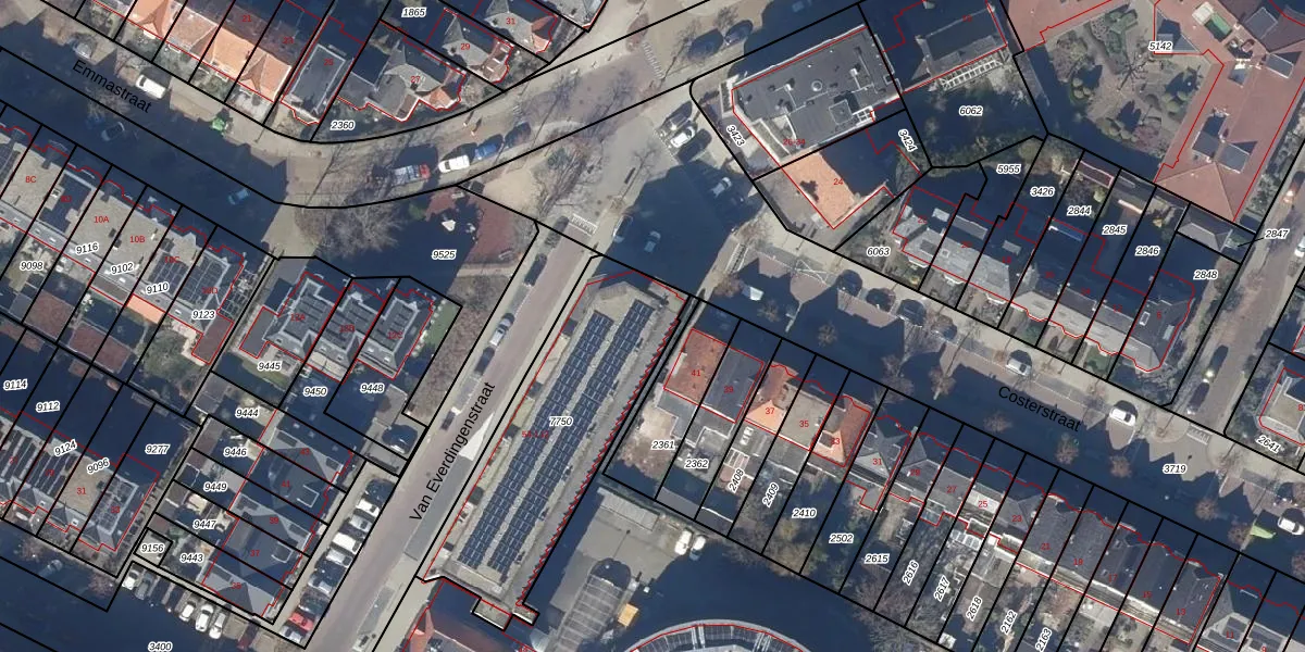 Het perceel waarop Van Everdingenstraat 102 staat heeft een oppervlakte van 950 m². Dit is een groot perceel. De perceeloppervlakte wordt geregistreerd door het Kadaster. Gedetailleerde informatie over de maten van dit perceel kunt u vinden in het rapport Kadastrale kaart met maatvoering van Van Everdingenstraat 102.