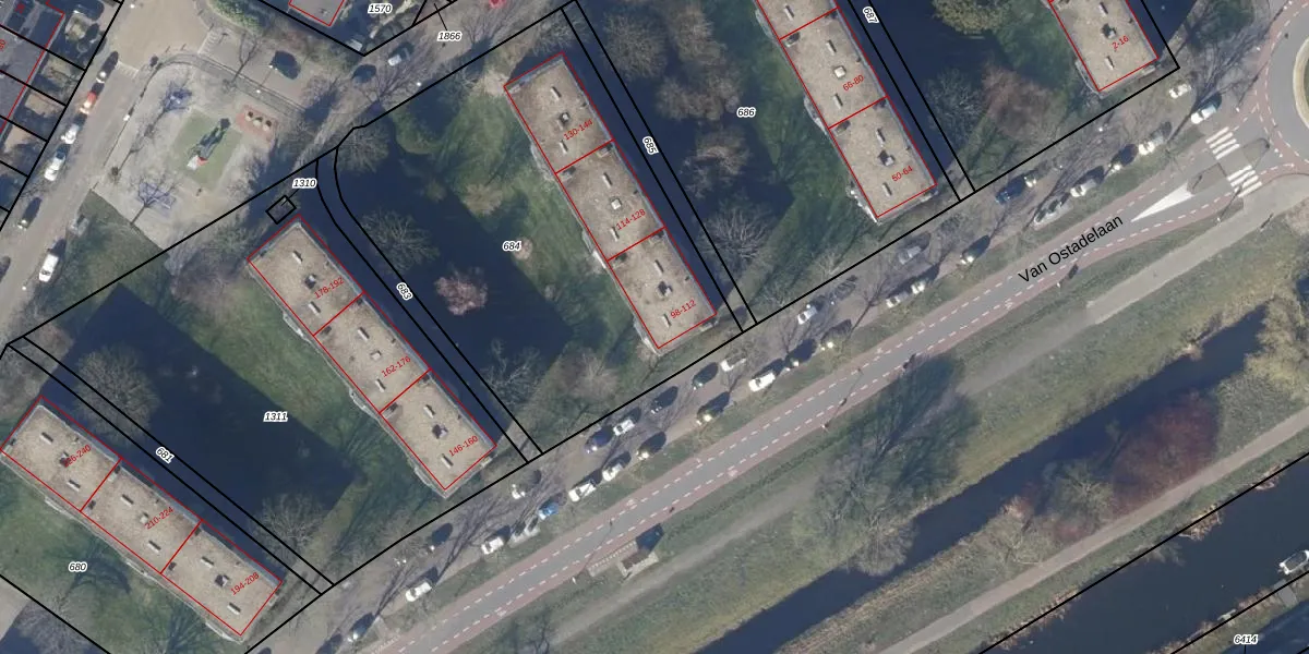 Van Ostadelaan 112 is gelegen op kadastraal perceel AMR01D684. Deze kadastrale aanduiding is uniek en wordt gebruikt door het Kadaster om eigendomsrechten en andere zakelijke rechten vast te leggen. Het perceel maakt onderdeel uit van de kadastrale gemeente Alkmaar.