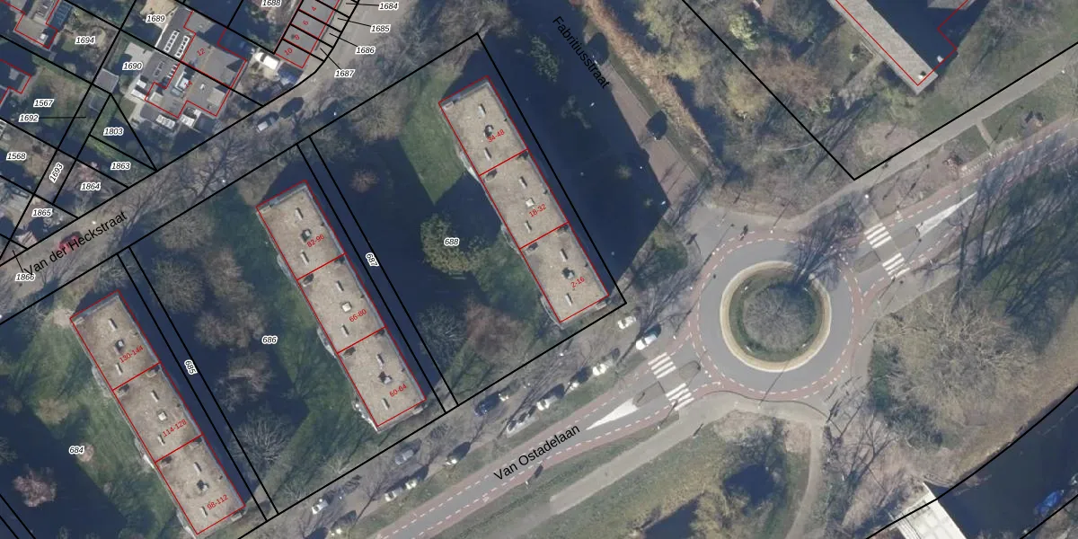 Het perceel waarop Van Ostadelaan 14 staat heeft een oppervlakte van 2075 m². Dit is een zeer groot perceel. De perceeloppervlakte wordt geregistreerd door het Kadaster. Gedetailleerde informatie over de maten van dit perceel kunt u vinden in het rapport Kadastrale kaart met maatvoering van Van Ostadelaan 14.