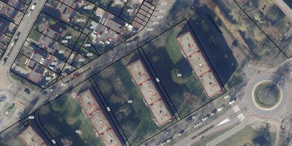 Het perceel waarop Van Ostadelaan 84 staat heeft een oppervlakte van 2076 m². Dit is een zeer groot perceel. De perceeloppervlakte wordt geregistreerd door het Kadaster. Gedetailleerde informatie over de maten van dit perceel kunt u vinden in het rapport Kadastrale kaart met maatvoering van Van Ostadelaan 84.