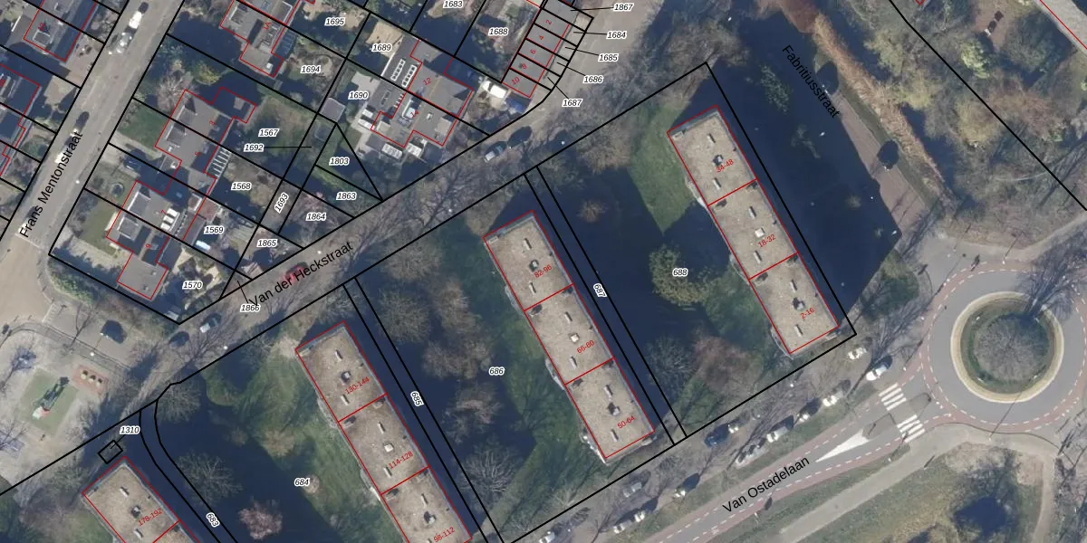 Het perceel waarop Van Ostadelaan 88 staat heeft een oppervlakte van 2076 m². Dit is een zeer groot perceel. De perceeloppervlakte wordt geregistreerd door het Kadaster. Gedetailleerde informatie over de maten van dit perceel kunt u vinden in het rapport Kadastrale kaart met maatvoering van Van Ostadelaan 88.