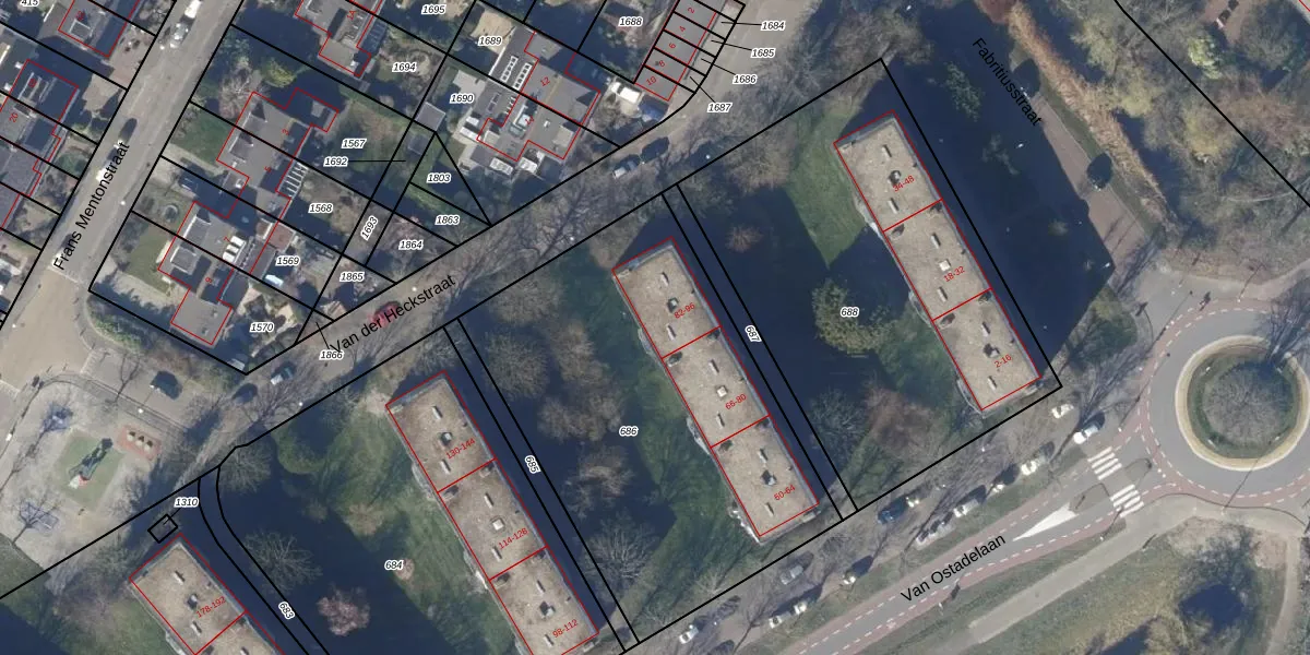 Het perceel waarop Van Ostadelaan 96 staat heeft een oppervlakte van 2076 m². Dit is een zeer groot perceel. De perceeloppervlakte wordt geregistreerd door het Kadaster. Gedetailleerde informatie over de maten van dit perceel kunt u vinden in het rapport Kadastrale kaart met maatvoering van Van Ostadelaan 96.