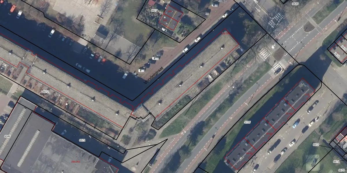 Het perceel waarop Vondelstraat 174 staat heeft een oppervlakte van 6869 m². Dit is een zeer groot perceel. De perceeloppervlakte wordt geregistreerd door het Kadaster. Gedetailleerde informatie over de maten van dit perceel kunt u vinden in het rapport Kadastrale kaart met maatvoering van Vondelstraat 174.