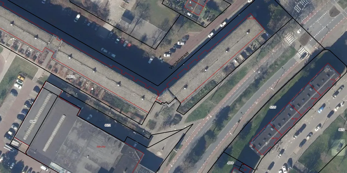 Het perceel waarop Vondelstraat 194 staat heeft een oppervlakte van 6869 m². Dit is een zeer groot perceel. De perceeloppervlakte wordt geregistreerd door het Kadaster. Gedetailleerde informatie over de maten van dit perceel kunt u vinden in het rapport Kadastrale kaart met maatvoering van Vondelstraat 194.