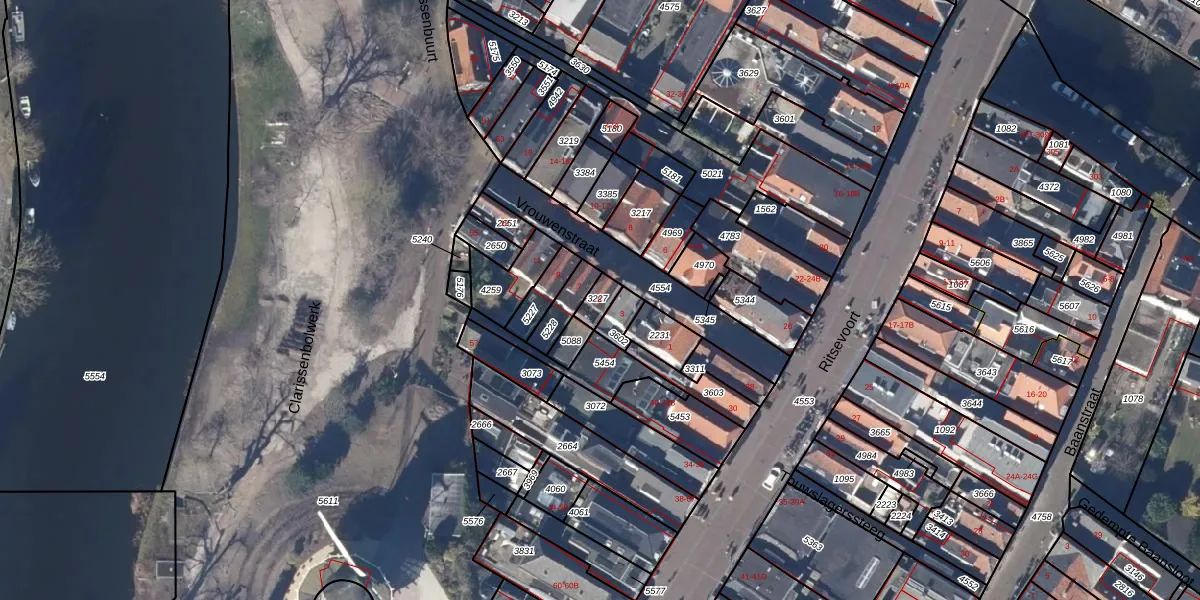 Het perceel waarop Vrouwenstraat 5 staat heeft een oppervlakte van 37 m². Dit is een klein perceel. De perceeloppervlakte wordt geregistreerd door het Kadaster. Gedetailleerde informatie over de maten van dit perceel kunt u vinden in het rapport Kadastrale kaart met maatvoering van Vrouwenstraat 5.