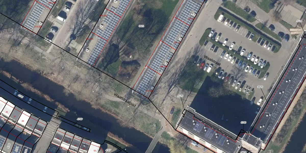 Het perceel waarop Waalstraat 179 staat heeft een oppervlakte van 4303 m². Dit is een zeer groot perceel. De perceeloppervlakte wordt geregistreerd door het Kadaster. Gedetailleerde informatie over de maten van dit perceel kunt u vinden in het rapport Kadastrale kaart met maatvoering van Waalstraat 179.