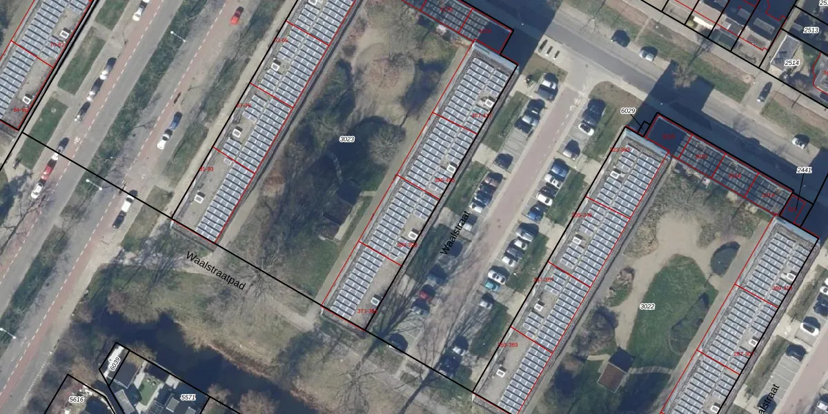 Waalstraat 385 is gelegen op kadastraal perceel ODP02A3023. Deze kadastrale aanduiding is uniek en wordt gebruikt door het Kadaster om eigendomsrechten en andere zakelijke rechten vast te leggen. Het perceel maakt onderdeel uit van de kadastrale gemeente Oudorp.