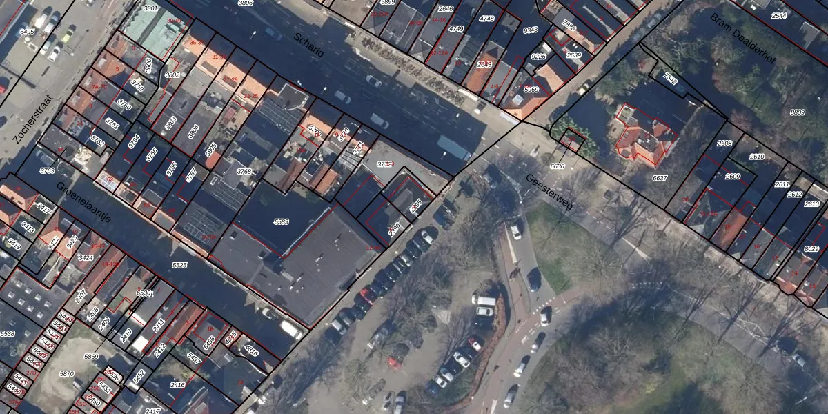 Gebruik de zoekbalk of klik op een perceel voor informatie over de adressen binnen dit perceel.
