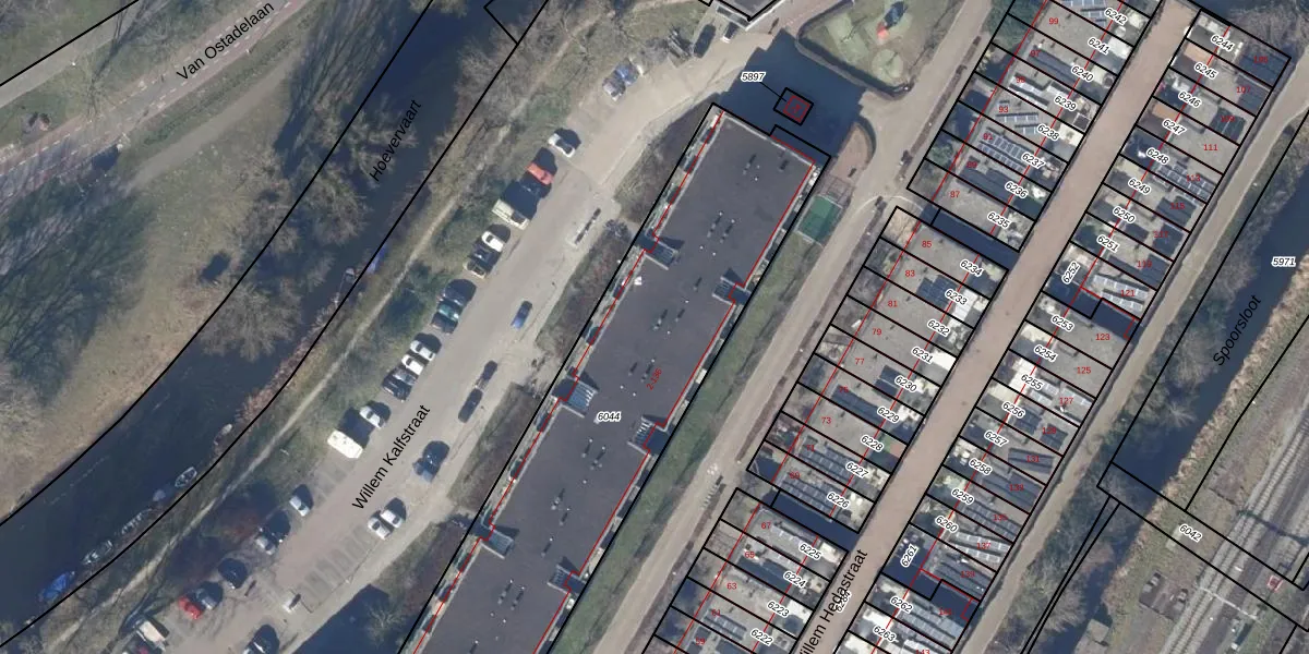 Het perceel waarop Willem Kalfstraat 56 staat heeft een oppervlakte van 1975 m². Dit is een zeer groot perceel. De perceeloppervlakte wordt geregistreerd door het Kadaster. Gedetailleerde informatie over de maten van dit perceel kunt u vinden in het rapport Kadastrale kaart met maatvoering van Willem Kalfstraat 56.