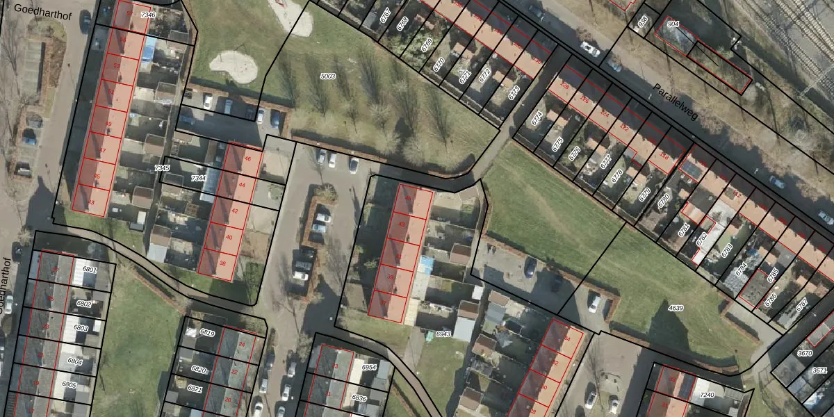 Het perceel waarop Aalbersehof 45 staat heeft een oppervlakte van 2340 m². Dit is een zeer groot perceel. De perceeloppervlakte wordt geregistreerd door het Kadaster. Gedetailleerde informatie over de maten van dit perceel kunt u vinden in het rapport Kadastrale kaart met maatvoering van Aalbersehof 45.