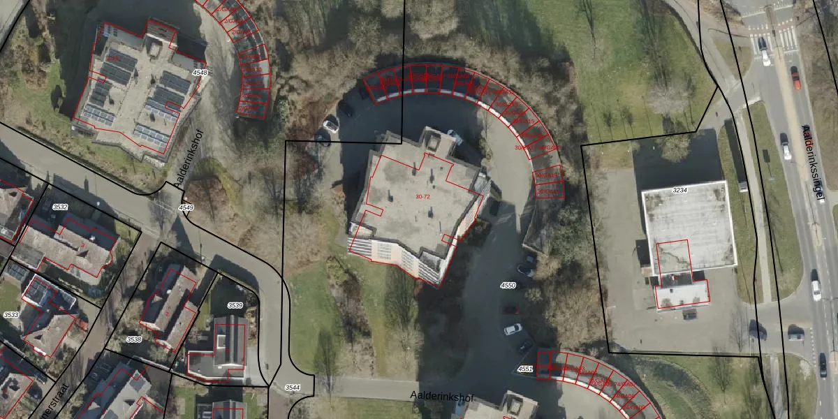 Aalderinkshof 48 is gelegen op kadastraal perceel AML01I4550. Deze kadastrale aanduiding is uniek en wordt gebruikt door het Kadaster om eigendomsrechten en andere zakelijke rechten vast te leggen. Het perceel maakt onderdeel uit van de kadastrale gemeente Ambt-Almelo.