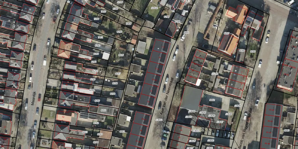 Het perceel waarop Aert van der Neerstraat 15 staat heeft een oppervlakte van 2500 m². Dit is een zeer groot perceel. De perceeloppervlakte wordt geregistreerd door het Kadaster. Gedetailleerde informatie over de maten van dit perceel kunt u vinden in het rapport Kadastrale kaart met maatvoering van Aert van der Neerstraat 15.