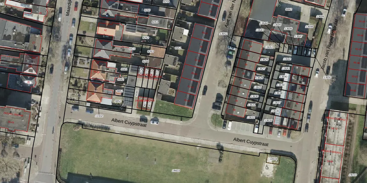 Het perceel waarop Aert van der Neerstraat 43 staat heeft een oppervlakte van 2500 m². Dit is een zeer groot perceel. De perceeloppervlakte wordt geregistreerd door het Kadaster. Gedetailleerde informatie over de maten van dit perceel kunt u vinden in het rapport Kadastrale kaart met maatvoering van Aert van der Neerstraat 43.