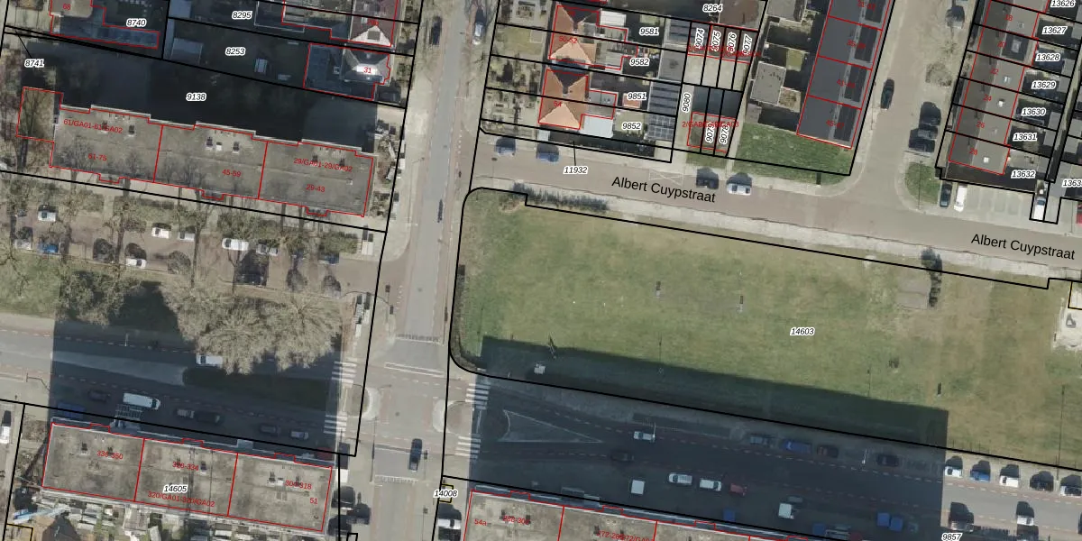 Albert Cuypstraat 1 is gelegen op kadastraal perceel AML01H14603. Deze kadastrale aanduiding is uniek en wordt gebruikt door het Kadaster om eigendomsrechten en andere zakelijke rechten vast te leggen. Het perceel maakt onderdeel uit van de kadastrale gemeente Ambt-Almelo.