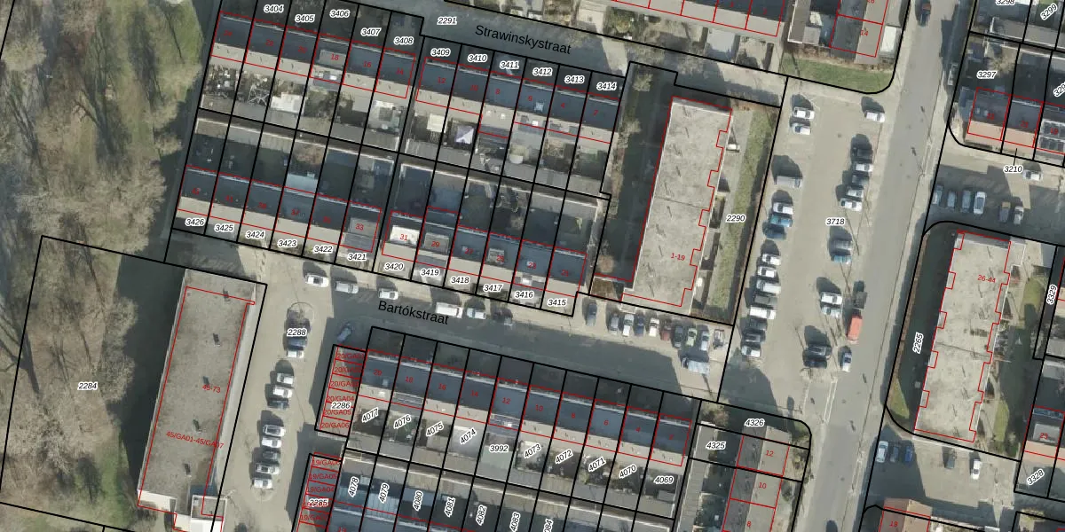 Gebruik de zoekbalk of klik op een perceel voor informatie over de adressen binnen dit perceel.