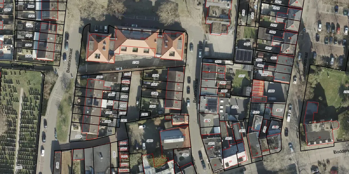 Beatrixstraat 25 is gelegen op kadastraal perceel AML01K2547. Deze kadastrale aanduiding is uniek en wordt gebruikt door het Kadaster om eigendomsrechten en andere zakelijke rechten vast te leggen. Het perceel maakt onderdeel uit van de kadastrale gemeente Ambt-Almelo.