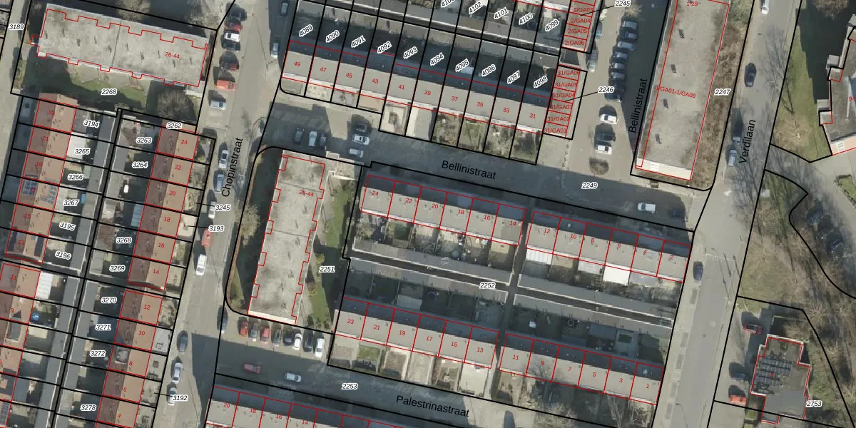 Het perceel waarop Bellinistraat 20 staat heeft een oppervlakte van 3800 m². Dit is een zeer groot perceel. De perceeloppervlakte wordt geregistreerd door het Kadaster. Gedetailleerde informatie over de maten van dit perceel kunt u vinden in het rapport Kadastrale kaart met maatvoering van Bellinistraat 20.
