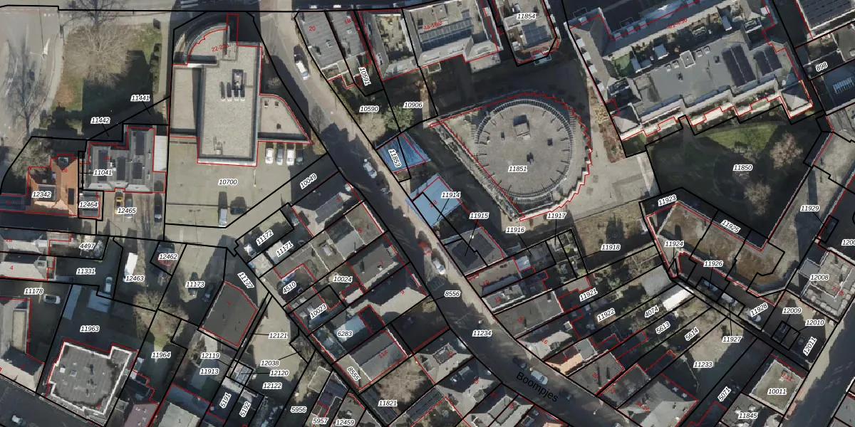 Het perceel waarop Boompjes 6 staat heeft een oppervlakte van 54 m². Dit is een klein perceel. De perceeloppervlakte wordt geregistreerd door het Kadaster. Gedetailleerde informatie over de maten van dit perceel kunt u vinden in het rapport Kadastrale kaart met maatvoering van Boompjes 6.