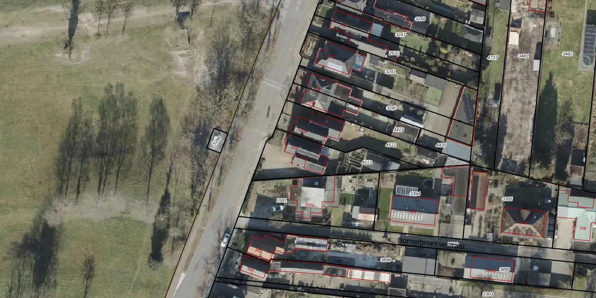 Bornerbroeksestraat 332 is gelegen op kadastraal perceel AML01G4513. Deze kadastrale aanduiding is uniek en wordt gebruikt door het Kadaster om eigendomsrechten en andere zakelijke rechten vast te leggen. Het perceel maakt onderdeel uit van de kadastrale gemeente Ambt-Almelo.