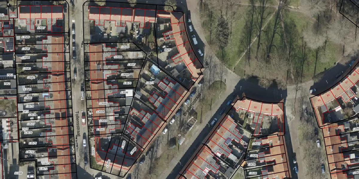 Brederostraat 1 is gelegen op kadastraal perceel AML01H13671. Deze kadastrale aanduiding is uniek en wordt gebruikt door het Kadaster om eigendomsrechten en andere zakelijke rechten vast te leggen. Het perceel maakt onderdeel uit van de kadastrale gemeente Ambt-Almelo.