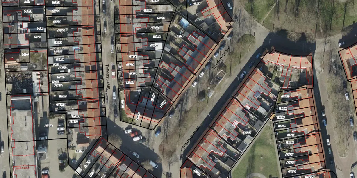 Brederostraat 13 is gelegen op kadastraal perceel AML01H13671. Deze kadastrale aanduiding is uniek en wordt gebruikt door het Kadaster om eigendomsrechten en andere zakelijke rechten vast te leggen. Het perceel maakt onderdeel uit van de kadastrale gemeente Ambt-Almelo.