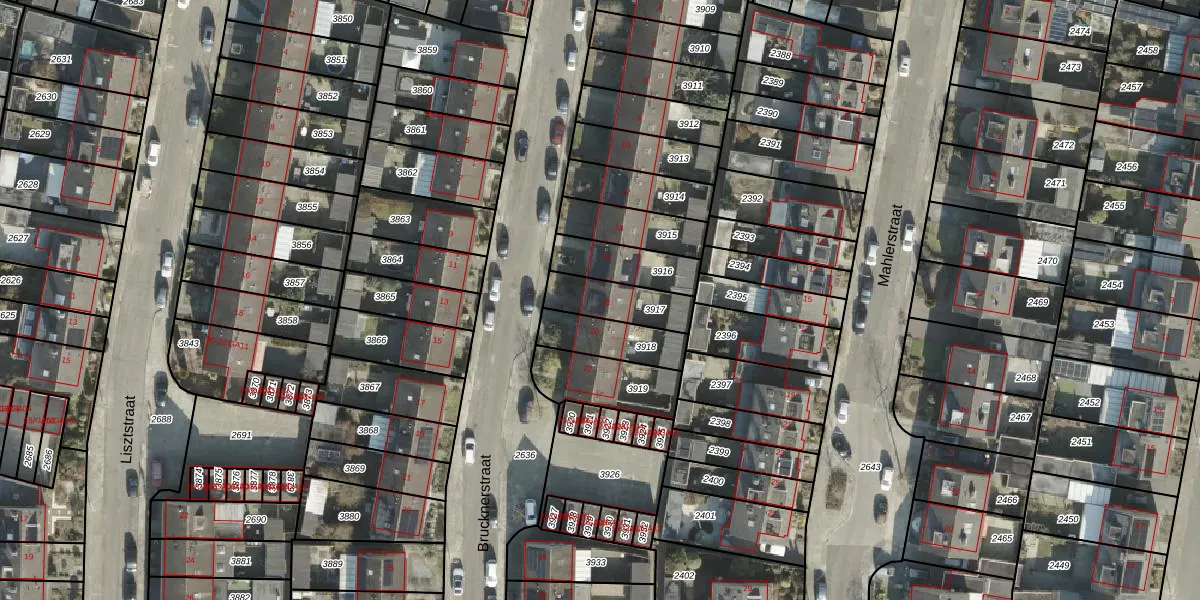 Het perceel waarop Brucknerstraat 18 staat heeft een oppervlakte van 156 m². Dit is een middelgroot perceel. De perceeloppervlakte wordt geregistreerd door het Kadaster. Gedetailleerde informatie over de maten van dit perceel kunt u vinden in het rapport Kadastrale kaart met maatvoering van Brucknerstraat 18.