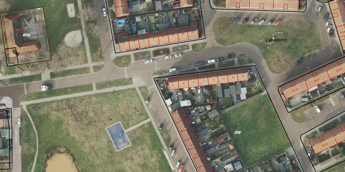Het perceel waarop Canadahof 1 staat heeft een oppervlakte van 4585 m². Dit is een zeer groot perceel. De perceeloppervlakte wordt geregistreerd door het Kadaster. Gedetailleerde informatie over de maten van dit perceel kunt u vinden in het rapport Kadastrale kaart met maatvoering van Canadahof 1.