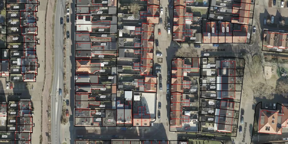 Het perceel waarop Celebesstraat 16 staat heeft een oppervlakte van 4079 m². Dit is een zeer groot perceel. De perceeloppervlakte wordt geregistreerd door het Kadaster. Gedetailleerde informatie over de maten van dit perceel kunt u vinden in het rapport Kadastrale kaart met maatvoering van Celebesstraat 16.