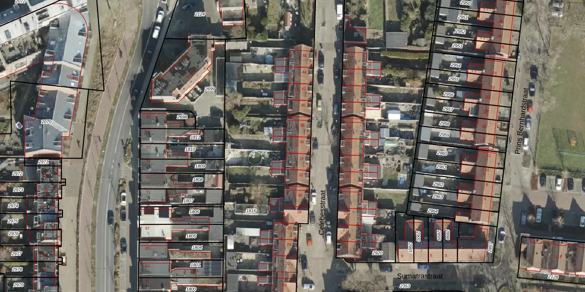 Het perceel waarop Celebesstraat 36 staat heeft een oppervlakte van 4079 m². Dit is een zeer groot perceel. De perceeloppervlakte wordt geregistreerd door het Kadaster. Gedetailleerde informatie over de maten van dit perceel kunt u vinden in het rapport Kadastrale kaart met maatvoering van Celebesstraat 36.