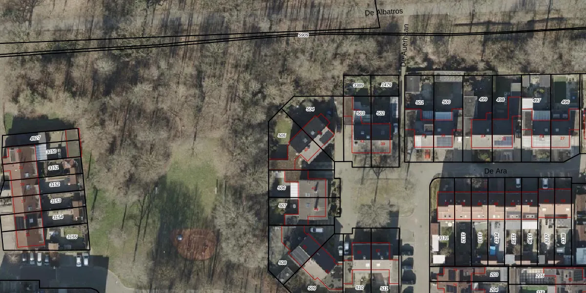 Het perceel waarop De Ara 45 staat heeft een oppervlakte van 302 m². Dit is een groot perceel. De perceeloppervlakte wordt geregistreerd door het Kadaster. Gedetailleerde informatie over de maten van dit perceel kunt u vinden in het rapport Kadastrale kaart met maatvoering van De Ara 45.
