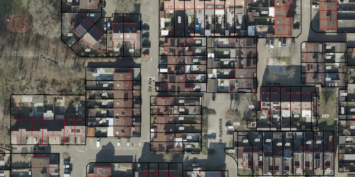 Het perceel waarop De Ara 84 staat heeft een oppervlakte van 141 m². Dit is een middelgroot perceel. De perceeloppervlakte wordt geregistreerd door het Kadaster. Gedetailleerde informatie over de maten van dit perceel kunt u vinden in het rapport Kadastrale kaart met maatvoering van De Ara 84.