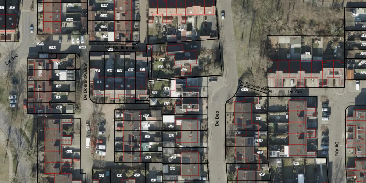 Het perceel waarop De Beo 16 staat heeft een oppervlakte van 326 m². Dit is een groot perceel. De perceeloppervlakte wordt geregistreerd door het Kadaster. Gedetailleerde informatie over de maten van dit perceel kunt u vinden in het rapport Kadastrale kaart met maatvoering van De Beo 16.