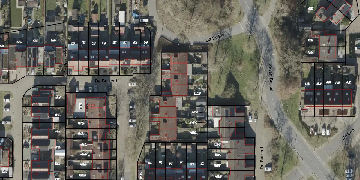 Het perceel waarop De Buizerd 37 staat heeft een oppervlakte van 1441 m². Dit is een zeer groot perceel. De perceeloppervlakte wordt geregistreerd door het Kadaster. Gedetailleerde informatie over de maten van dit perceel kunt u vinden in het rapport Kadastrale kaart met maatvoering van De Buizerd 37.
