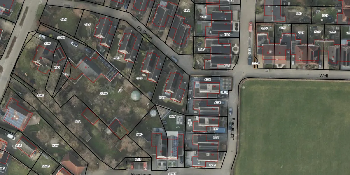 Het perceel waarop De Croon 2 staat heeft een oppervlakte van 464 m². Dit is een groot perceel. De perceeloppervlakte wordt geregistreerd door het Kadaster. Gedetailleerde informatie over de maten van dit perceel kunt u vinden in het rapport Kadastrale kaart met maatvoering van De Croon 2.