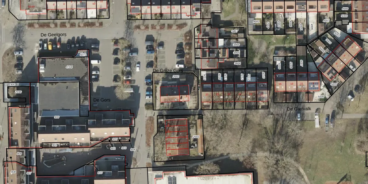 Het perceel waarop De Gors 6 staat heeft een oppervlakte van 489 m². Dit is een groot perceel. De perceeloppervlakte wordt geregistreerd door het Kadaster. Gedetailleerde informatie over de maten van dit perceel kunt u vinden in het rapport Kadastrale kaart met maatvoering van De Gors 6.