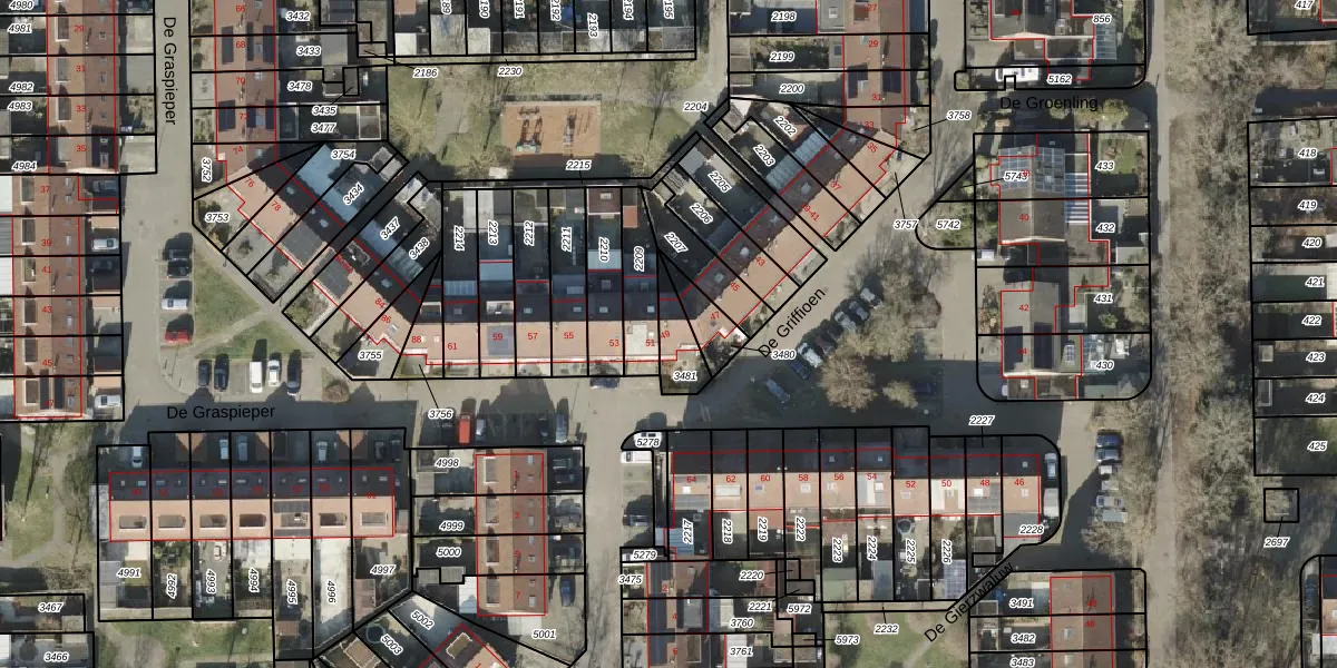 Het perceel waarop De Griffioen 49 staat heeft een oppervlakte van 92 m². Dit is een klein perceel. De perceeloppervlakte wordt geregistreerd door het Kadaster. Gedetailleerde informatie over de maten van dit perceel kunt u vinden in het rapport Kadastrale kaart met maatvoering van De Griffioen 49.