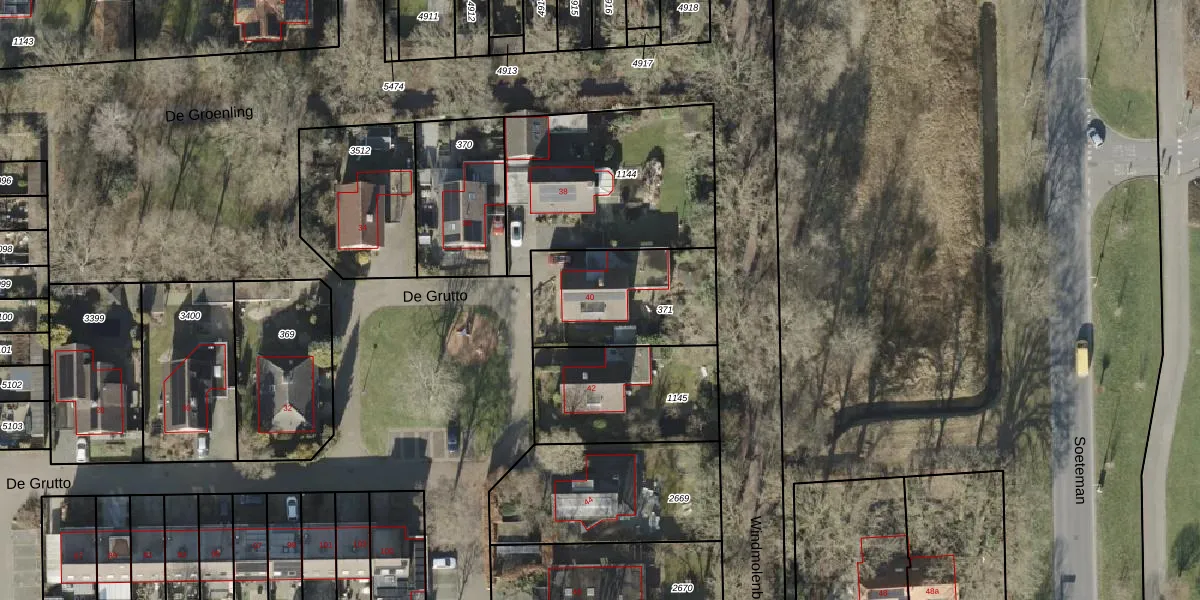 Het perceel waarop De Grutto 40 staat heeft een oppervlakte van 492 m². Dit is een groot perceel. De perceeloppervlakte wordt geregistreerd door het Kadaster. Gedetailleerde informatie over de maten van dit perceel kunt u vinden in het rapport Kadastrale kaart met maatvoering van De Grutto 40.
