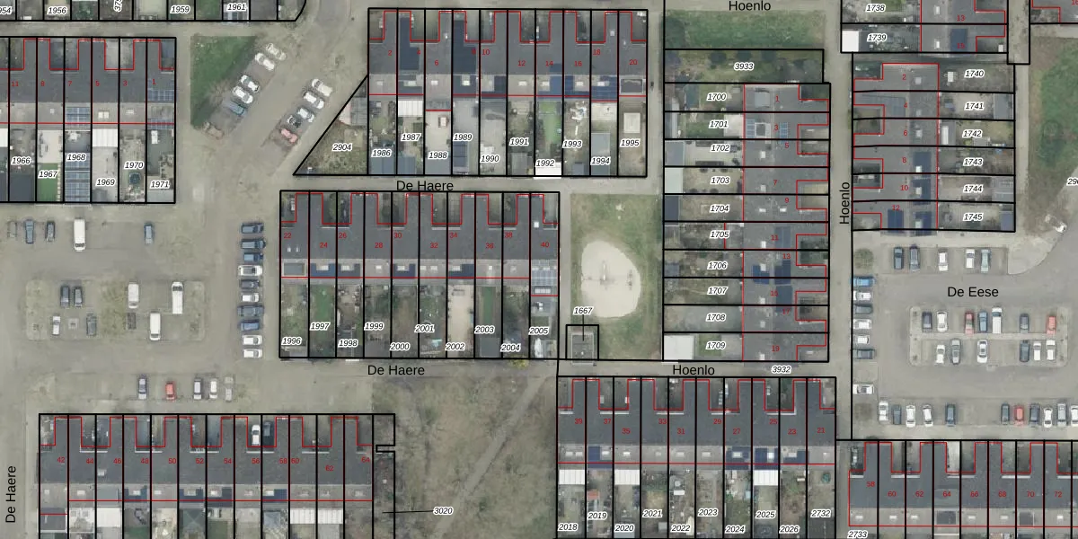 Het perceel waarop De Haere 40 staat heeft een oppervlakte van 165 m². Dit is een middelgroot perceel. De perceeloppervlakte wordt geregistreerd door het Kadaster. Gedetailleerde informatie over de maten van dit perceel kunt u vinden in het rapport Kadastrale kaart met maatvoering van De Haere 40.