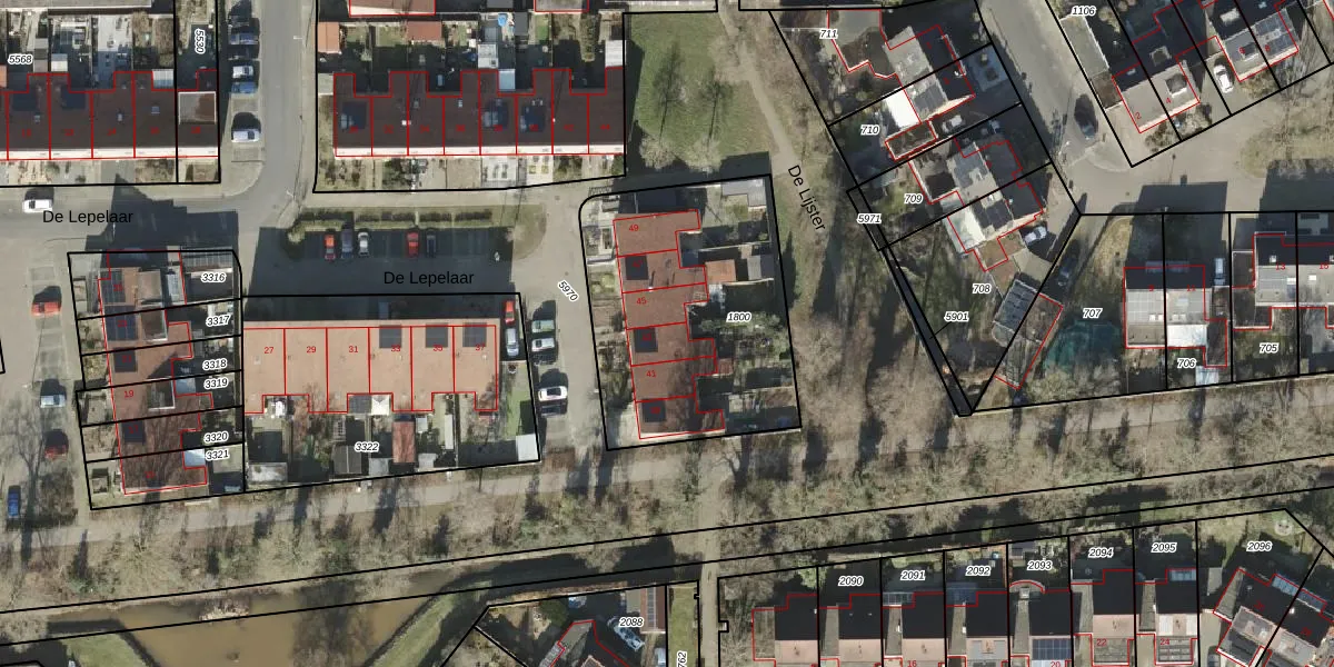 Het perceel waarop De Lepelaar 43 staat heeft een oppervlakte van 1110 m². Dit is een zeer groot perceel. De perceeloppervlakte wordt geregistreerd door het Kadaster. Gedetailleerde informatie over de maten van dit perceel kunt u vinden in het rapport Kadastrale kaart met maatvoering van De Lepelaar 43.