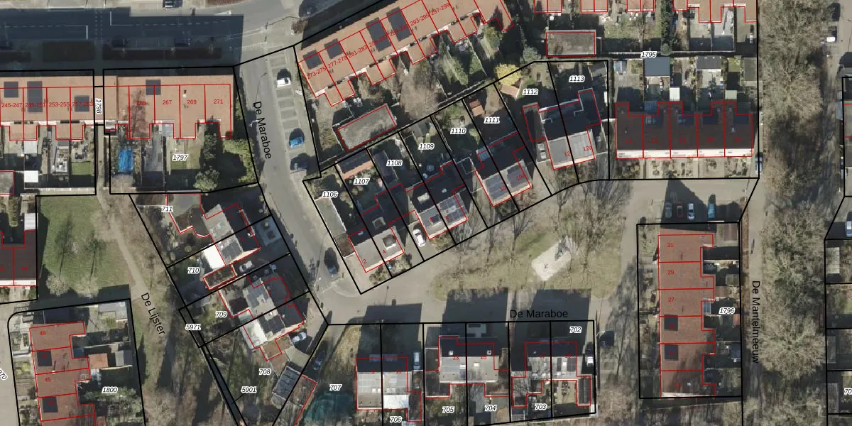 Het perceel waarop De Maraboe 6 staat heeft een oppervlakte van 252 m². Dit is een middelgroot perceel. De perceeloppervlakte wordt geregistreerd door het Kadaster. Gedetailleerde informatie over de maten van dit perceel kunt u vinden in het rapport Kadastrale kaart met maatvoering van De Maraboe 6.