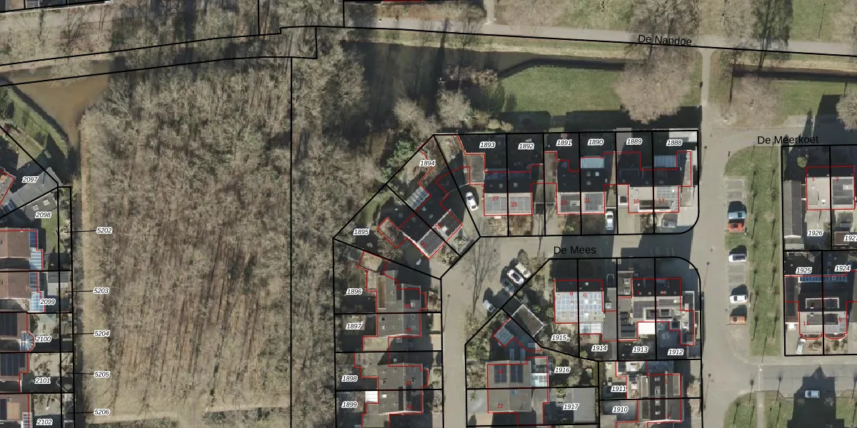 Het perceel waarop De Mees 29 staat heeft een oppervlakte van 275 m². Dit is een middelgroot perceel. De perceeloppervlakte wordt geregistreerd door het Kadaster. Gedetailleerde informatie over de maten van dit perceel kunt u vinden in het rapport Kadastrale kaart met maatvoering van De Mees 29.