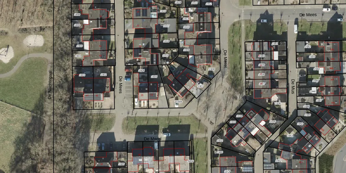 Het perceel waarop De Merel 11 staat heeft een oppervlakte van 264 m². Dit is een middelgroot perceel. De perceeloppervlakte wordt geregistreerd door het Kadaster. Gedetailleerde informatie over de maten van dit perceel kunt u vinden in het rapport Kadastrale kaart met maatvoering van De Merel 11.