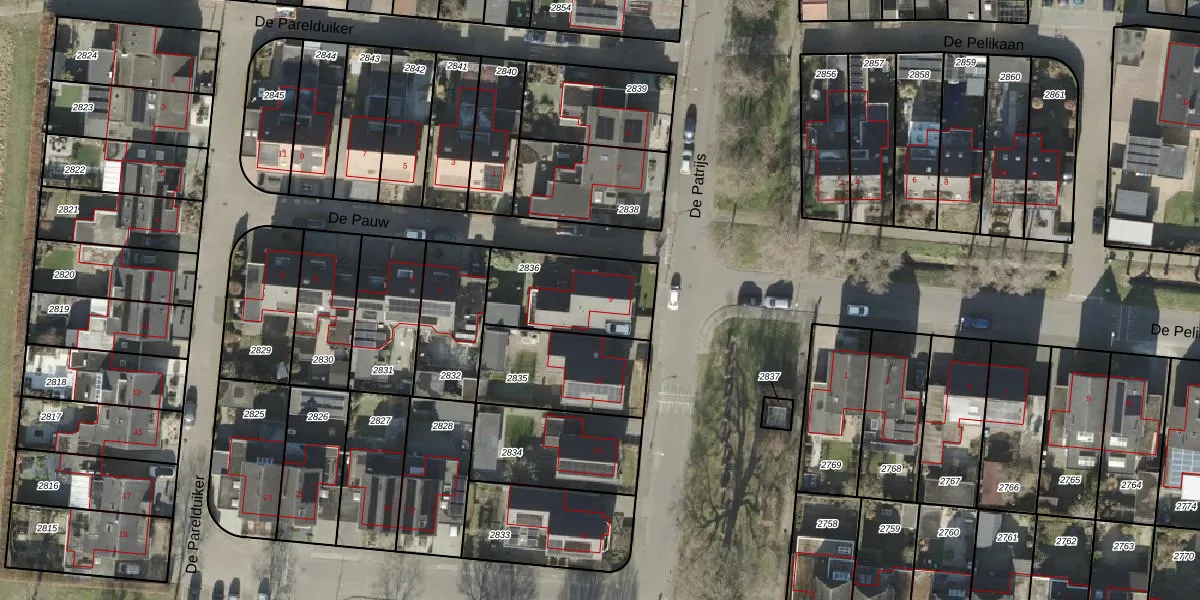 Het perceel waarop De Patrijs 9 staat heeft een oppervlakte van 361 m². Dit is een groot perceel. De perceeloppervlakte wordt geregistreerd door het Kadaster. Gedetailleerde informatie over de maten van dit perceel kunt u vinden in het rapport Kadastrale kaart met maatvoering van De Patrijs 9.