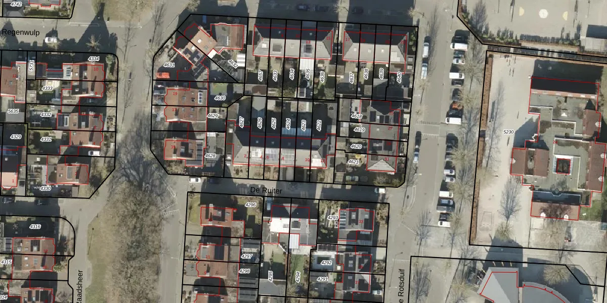 Het perceel waarop De Ruiter 10 staat heeft een oppervlakte van 139 m². Dit is een middelgroot perceel. De perceeloppervlakte wordt geregistreerd door het Kadaster. Gedetailleerde informatie over de maten van dit perceel kunt u vinden in het rapport Kadastrale kaart met maatvoering van De Ruiter 10.