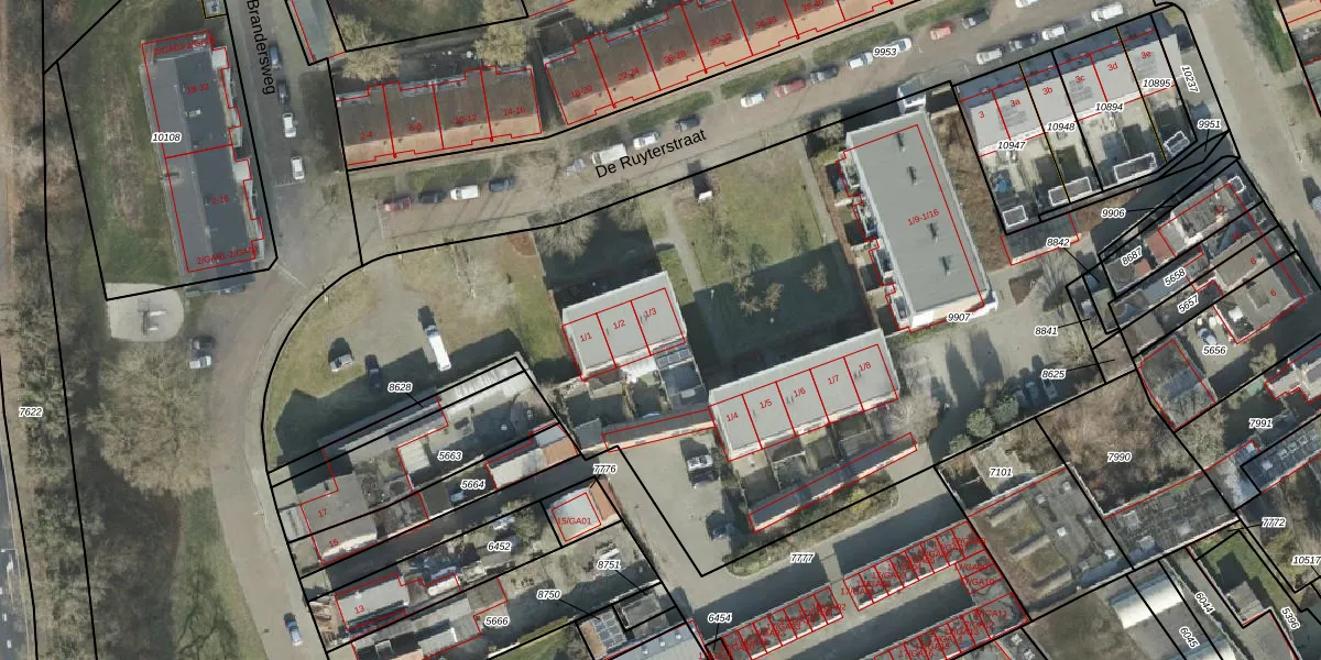 De Ruyterstraat 1-3 is gelegen op kadastraal perceel AML01B9907. Deze kadastrale aanduiding is uniek en wordt gebruikt door het Kadaster om eigendomsrechten en andere zakelijke rechten vast te leggen. Het perceel maakt onderdeel uit van de kadastrale gemeente Ambt-Almelo.