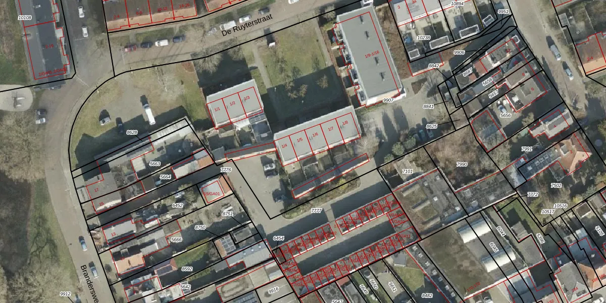 De Ruyterstraat 1-5 is gelegen op kadastraal perceel AML01B9907. Deze kadastrale aanduiding is uniek en wordt gebruikt door het Kadaster om eigendomsrechten en andere zakelijke rechten vast te leggen. Het perceel maakt onderdeel uit van de kadastrale gemeente Ambt-Almelo.